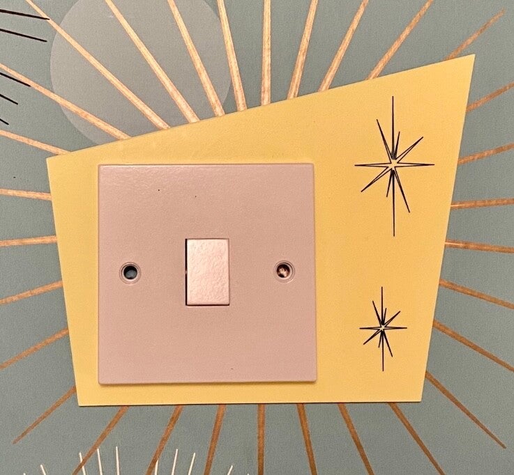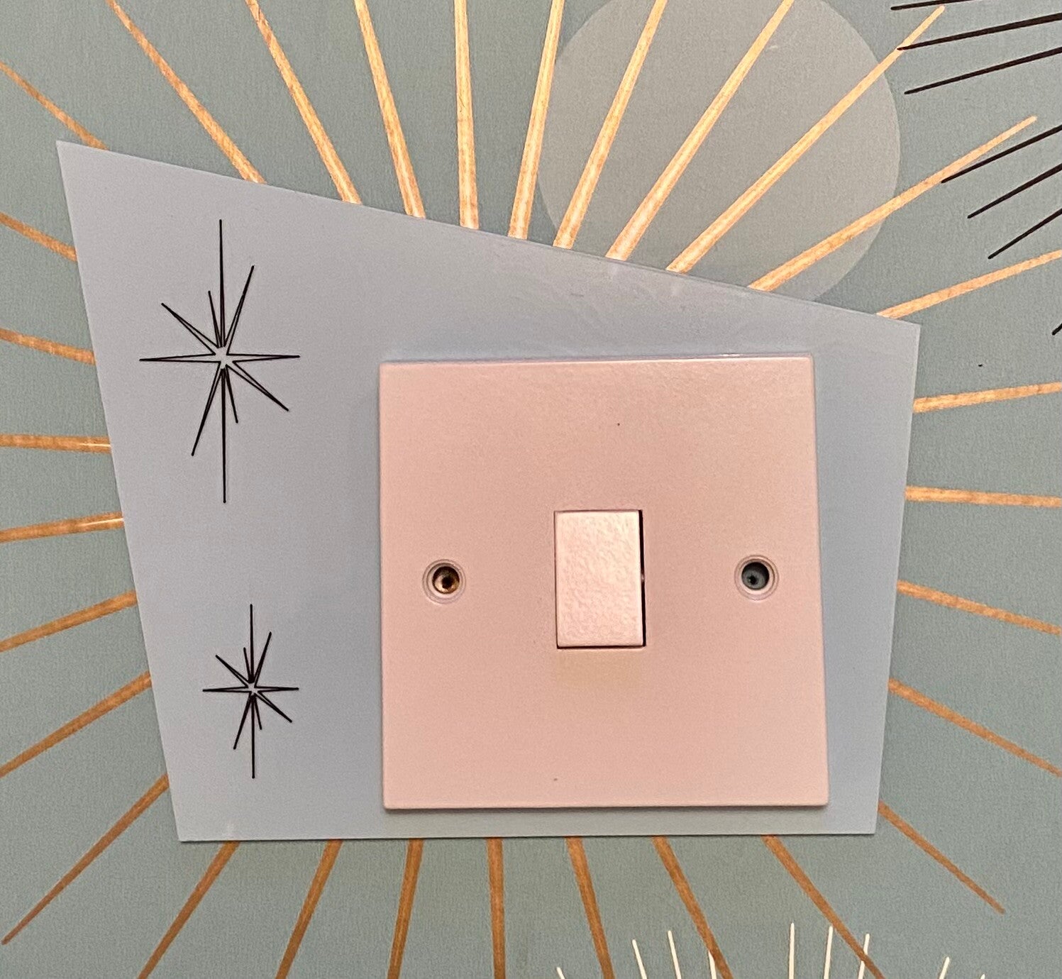fits standard uk light switches and sits behind the switch, leaving no gaps. its fixed onto the wall by your existing screws.