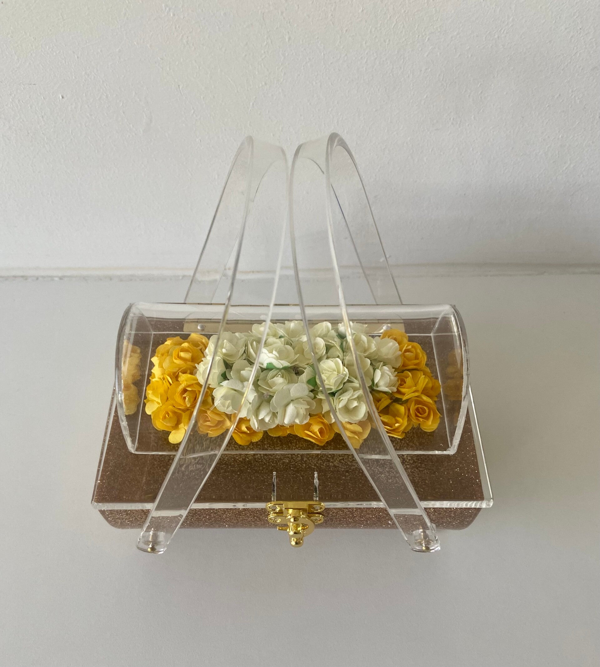 The clear lid has an encasement of yellow flowers with light yellow/cream flowers in the centre