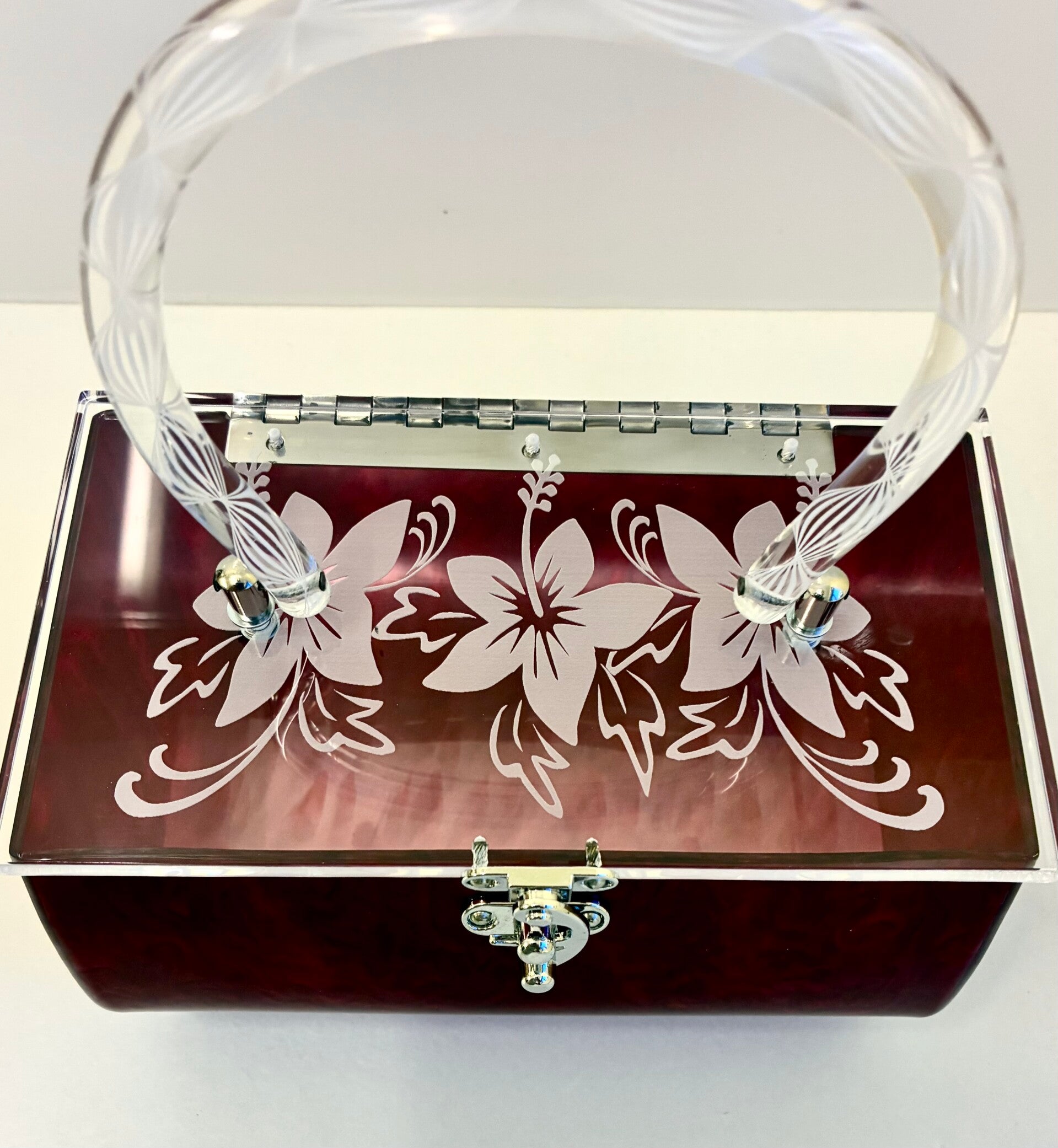 This has a swirl handle and our 3 Habiscus etched pattern on the lid