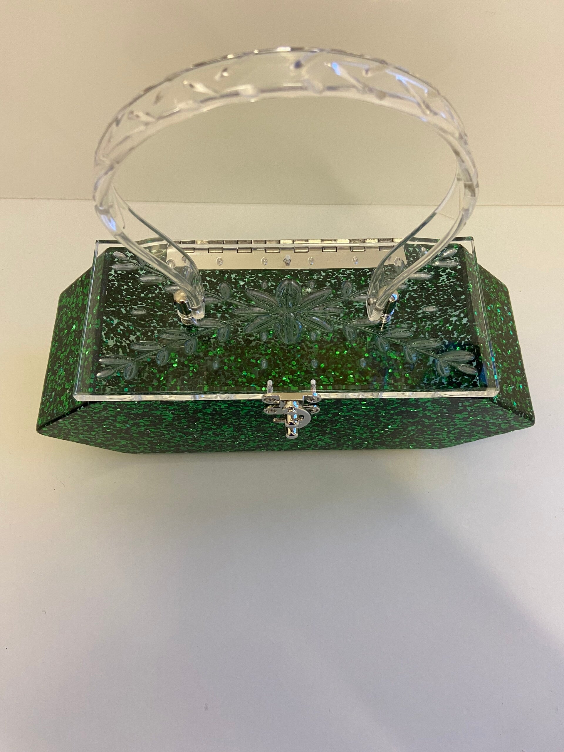 La Premiere Lucite vintage style Purse. Green Flake Glitter