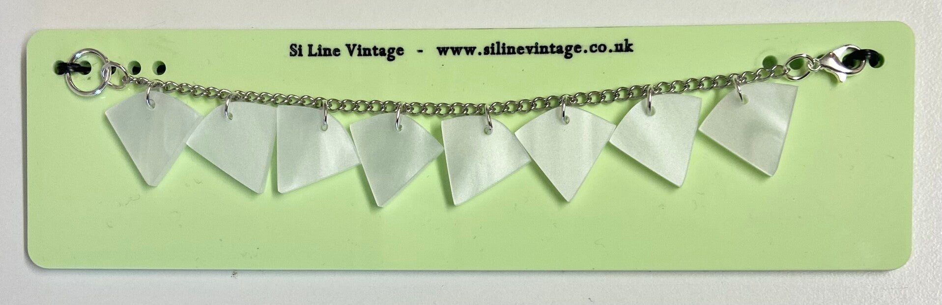 The Necklace and Bracelet Fan shaped charms are in a White Pearl Acrylic.